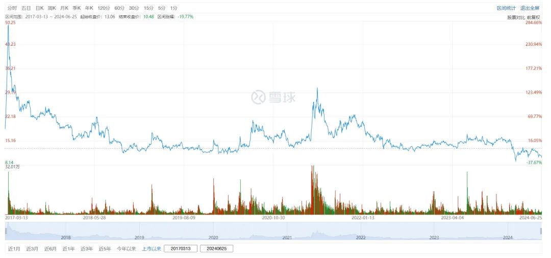 具体来看,2017年,拉芳家化成功于上交所上市,据投资者网报道,上市当月,拉芳家化股价由18.39元/股的发行价大幅增长395.54%,市值由46.18亿狂飙至126.88亿元。而其后,拉芳家化就逐渐由盛转衰。目前,拉芳家化市值为23.6亿元,不到高峰期的1/5。