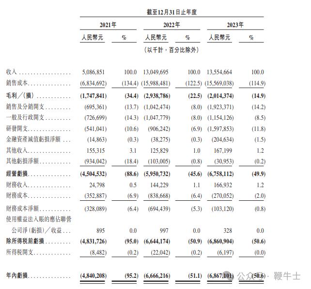 利润方面,与大多数新势力一样,哪吒汽车也逃不过增收不增利的困境。年内亏损分别为48.4亿元、66.66亿元、68.67亿元,三年合计亏损超184亿元;毛利率分别为-34.4%,-22.5%,-14.9%。