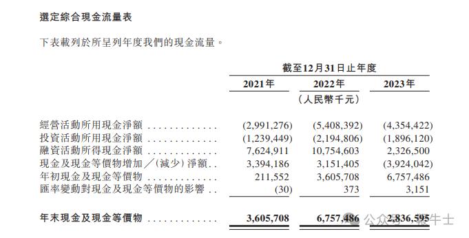 连年亏损下,哪吒汽车的现金流也持续承压。2021年、2022年及2023年,负经营现金流量分别为人民币29.913亿元、54.084亿元及43.544亿元。