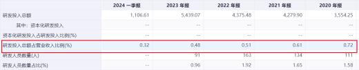 近年来东鹏的年报显示,相较于接近20%的销售费用,东鹏的研发费用占收入比例逐年下降,2021-2023年分别为0.61%、0.51%、0.48%。此外,与营收超过百亿的爆发式增长相对应的是,公司产品研发人员数量却呈现出减少趋势,从2022年的163人降至2023年年末的91人,下降幅度接近50%。这一现象,可能成为东鹏未来增长的潜在隐患。