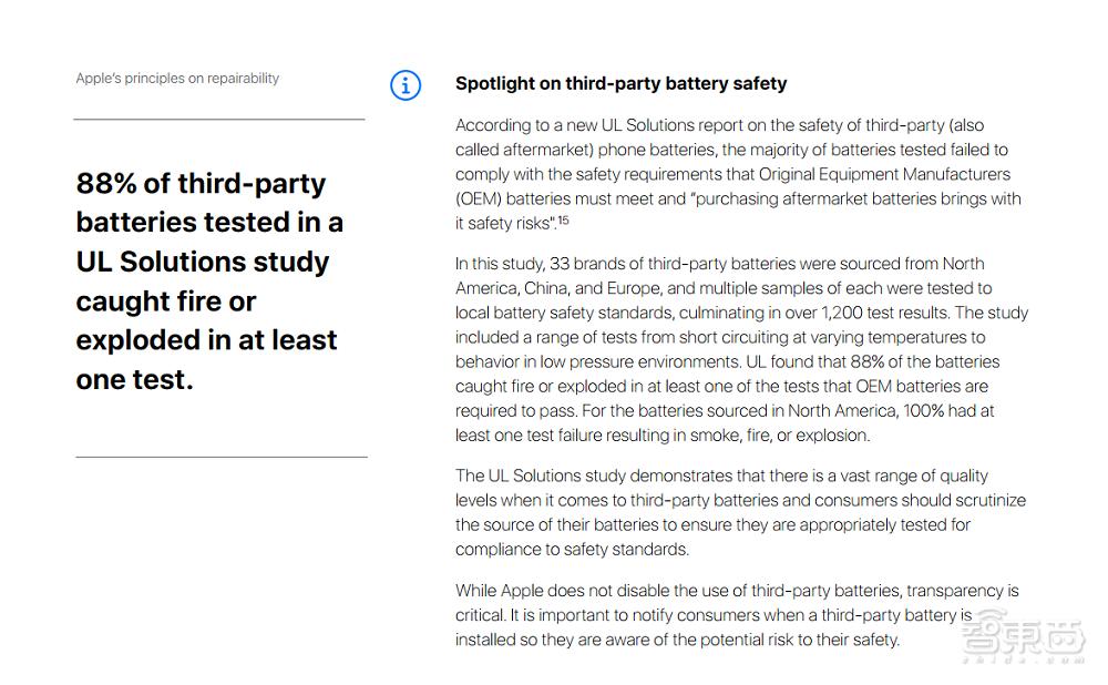 白皮书强调了苹果对第三方电池的谨慎态度,书中提及了UL Solutions关于第三方手机电池安全的新报告,UL进行了一系列测试,包括不同温度下的电池短路和低压环境下的电池行为。UL发现,88%的第三方电池会在原始设备制造商(OEM)规定的一项质检测试中起火或爆炸。对于来自北美的电池,100%至少有一次测试失败导致烟雾,火灾或爆炸。