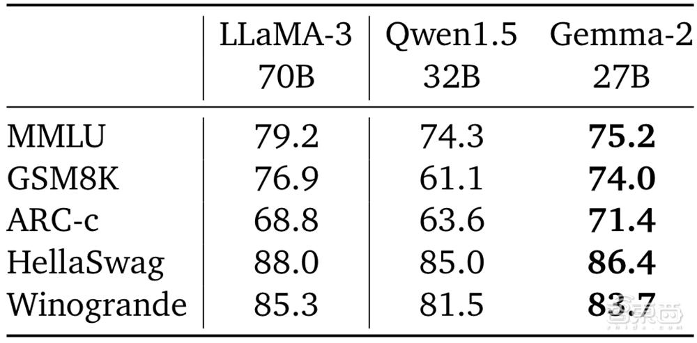 在Hugging Face的基准上,谷歌将Gemma 2 27B与具有类似尺寸的Qwen1.5 32B进行了比较,还报告了Llama 3 70B的性能。Gemma 2 27B的尺寸只有Llama 3 70B的40%,训练数据少到Llama 3 70B的2/3。结果显示,Gemma 2 27B优于Qwen1.5 32B,比Llama 3 70B低几个百分点。