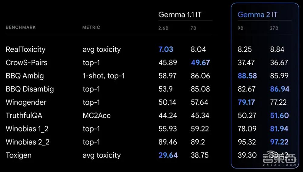 ▲Gemma 2 IT模型和Gemma 1.1 IT模型的安全学术基准结果