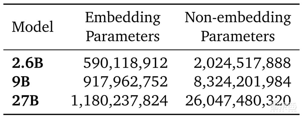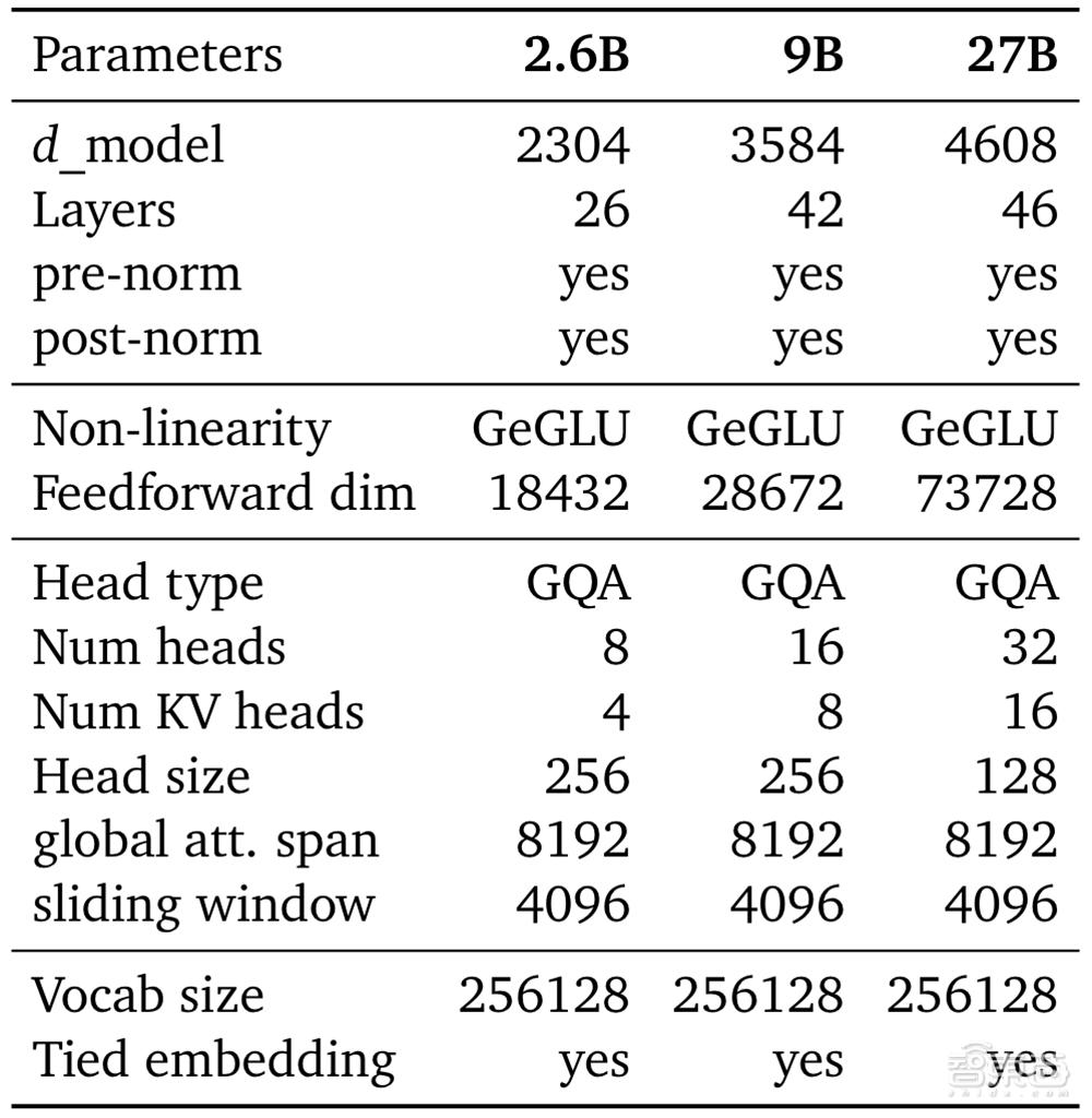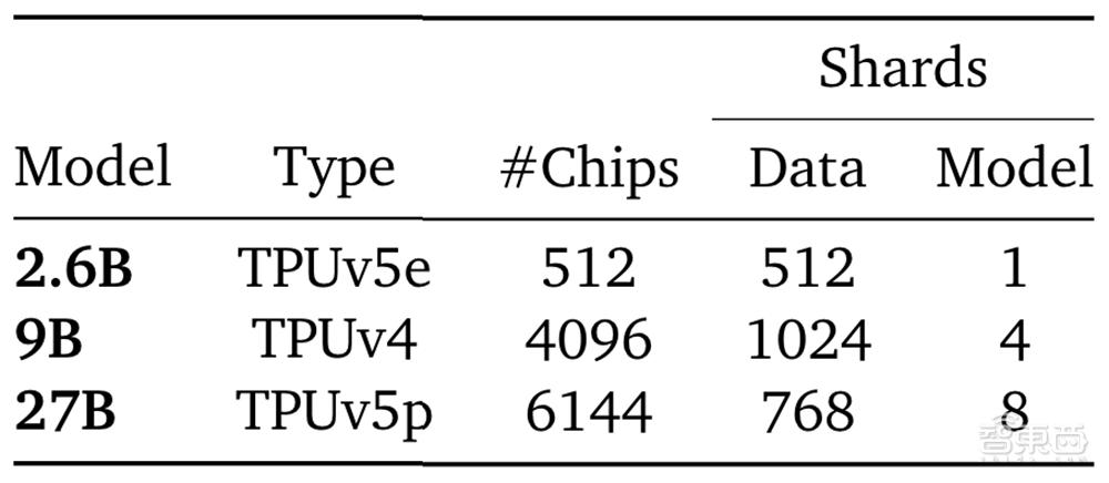 2.6B模型在一个TPUv5e集群的2x16x16配置上训练,总共用了512张芯片。9B模型在TPUv4集群的8x16x32配置上训练,总共4096张芯片。27B模型在TPUv5p集群的8x24x32配置上训练,总共用了6144张芯片。