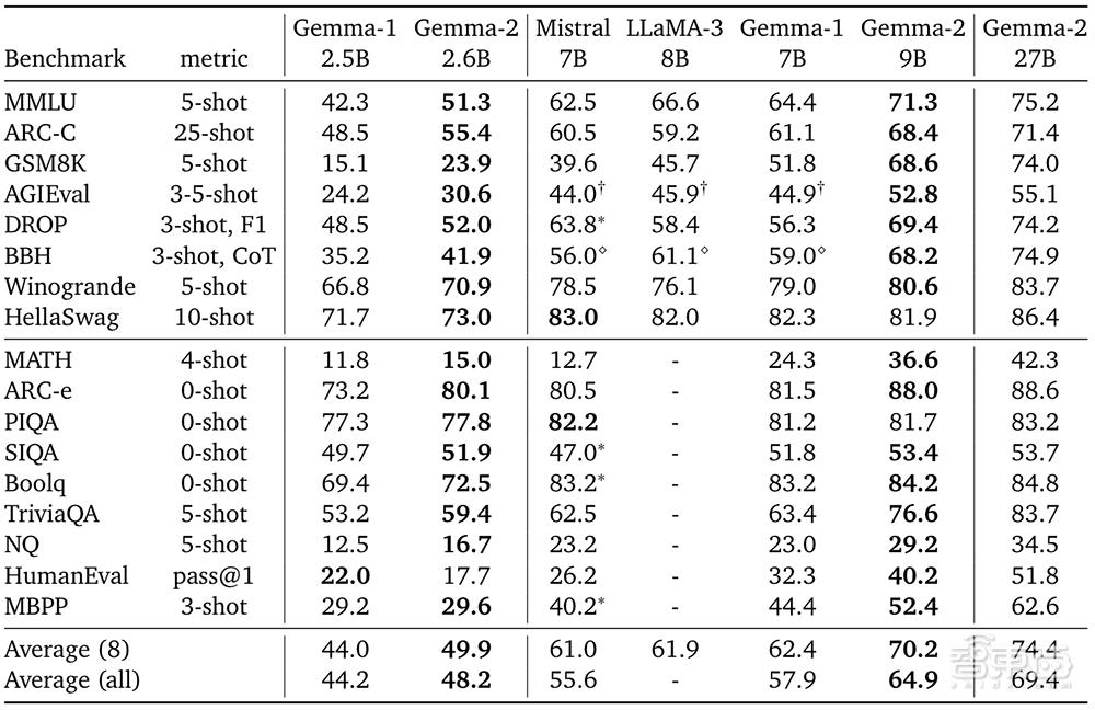 谷歌在各种基准上比较2.6B、9B及27B模型,报告了可以与Llama 3进行比较的8个基准测试的平均性能,以及所有基准测试的平均性能。Llama 3 8B的数据来自HuggingFace leaderboard或其博客。