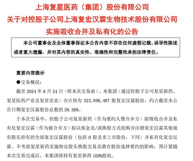 6月24日晚间,复星医药公告,控股子公司复星新药与另一控股子公司复宏汉霖(即被合并方)订立《吸收合并协议》,根据协议,复星新药拟以现金及/或换股方式收购并注销复宏汉霖其他现有股东持有的全部复宏汉霖股份(包括H股及非上市股份),并私有化复宏汉霖。
