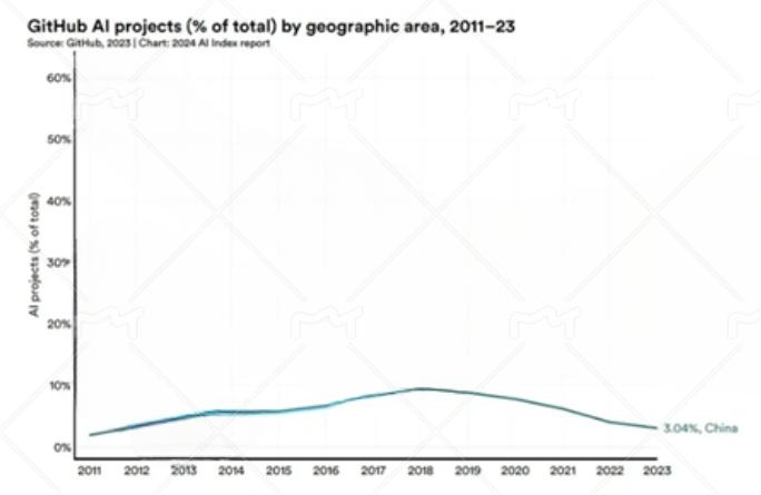 实际上,中国AI产学界始终保持着开放心态,积极吸收国际先进技术,与世界接轨。斯坦福大学发布的《2024 年人工智能指数报告》显示,自2011年以来,GitHub上的开源人工智能项目,中国参与度不断增长,直到2019年在科技领域遭受不合理打压之后,才开始走低。