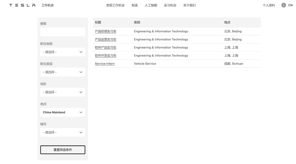 特斯拉裁员裁的很干净利落,打脸也来得非常快。不久,特斯拉就在官网发布了销售实习生的招聘公告,此外产品经理实习生、产品运营实习生、软件产品实习生、软件开发实习生等岗位均在显示招聘。