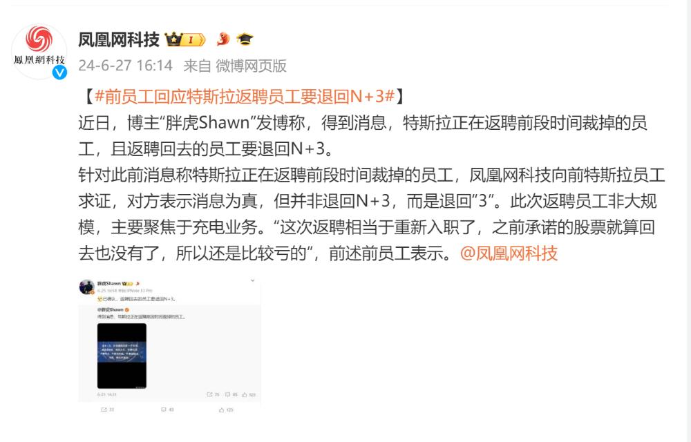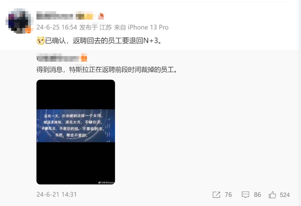 ▲博主爆料特斯拉返聘员工要返还辞退补偿