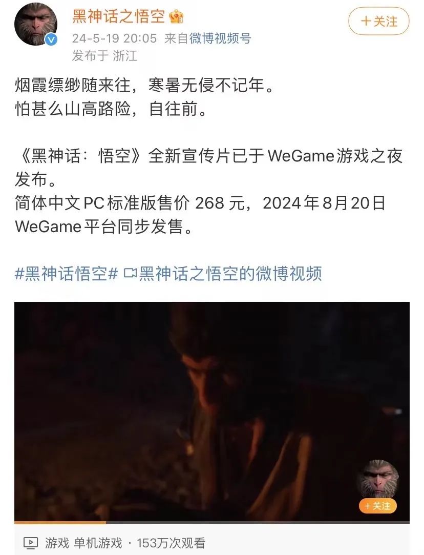 在上月底举办的WeGame2024游戏之夜上,《黑神话:悟空》官方便发布了全新宣传片,并公布了国内游戏PC标准版的268元的定价,几乎成为了这场腾讯游戏发布会产生的唯一话题。