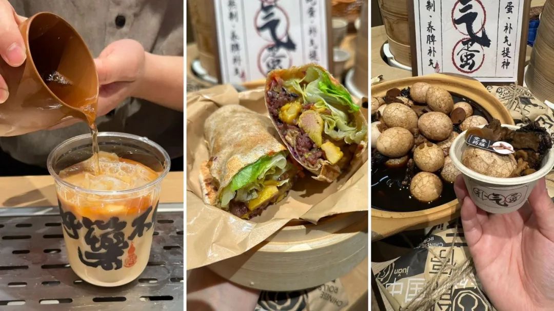 出餐也注重体验感。做好的饮品盖上中式茶碗形状的杯盖,放在木质托盘上,旁边撒上各种草药做装饰,还附上老黄历样式的产品介绍卡。卷饼则被装在纸质长筒盒里,用麻绳捆着,乍一看像中式画轴。