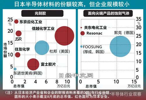 而在上游的材料领域,日本企业的影响力也非常大。日本的野村证券调查了2022年度不同材料按销售额计算的份额:在电路微细化所需要的“EUV光掩模坯料”领域,HOYA和AGC两家企业占有100%的市场份额;在形成电路时使用的“光刻胶”(感光材料)领域,JSR及东京应化工业等5家日本企业占有91%的市场份额。主要用于前工序的研磨液“CMP抛光液”48%的市场份额被富士胶片控股等3家日本企业占据;在半导体晶圆的全球产能中,信越化学工业和SUMCO两家日企约占50%。虽然韩国等海外企业实力增强,但用于生产半导体(在电子产品中发挥着“头脑”的作用)高端产品的晶圆被认为只有这2家企业能够生产。
