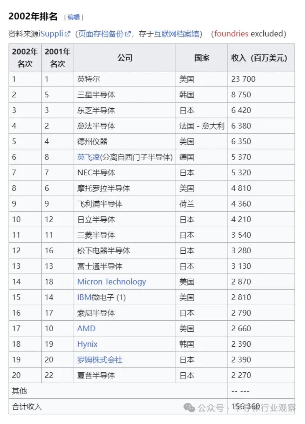 这也导致了一个问题,韩国半导体产业自始自终都没有出现过日本半导体产业那样百花齐放百家争鸣的局面,三星一家独大成为了韩国半导体产业的常态,以2002年为例,尽管此时日本半导体已经在走下坡路,但全球半导体销售额TOP 20中,依旧有9家日企,而韩国半导体仅有三星和海力士两家,海力士还处在第18名的位置,尽管三星已经成为DRAM老大多年,但并未带动整个韩国半导体行业的发展。
