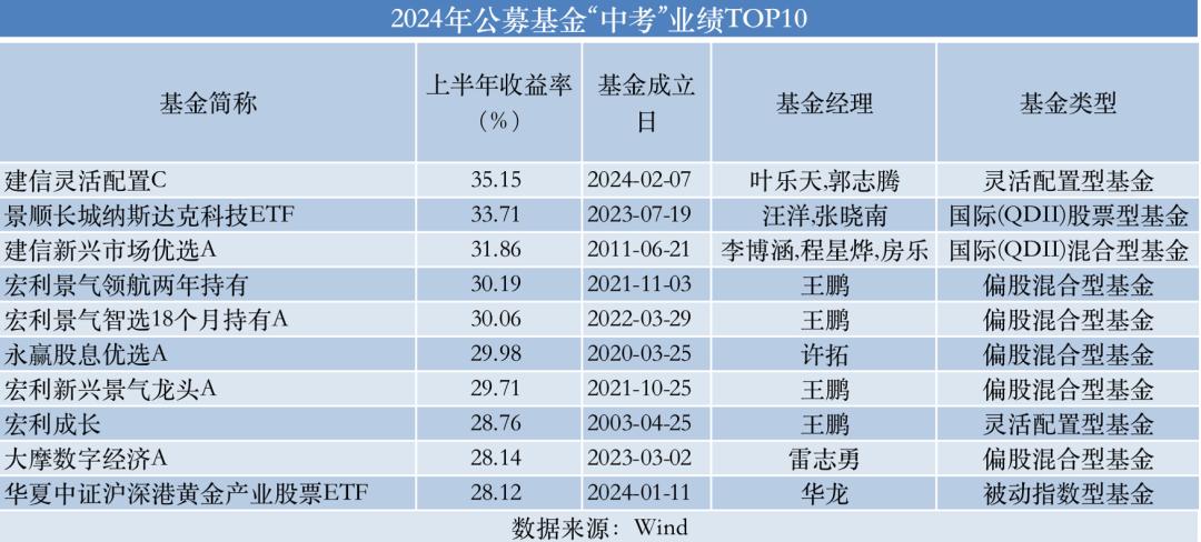 上半年业绩最好的10只产品中,有5只偏股混合基金、2只灵活配置基金、2只QDII基金,1只黄金ETF。