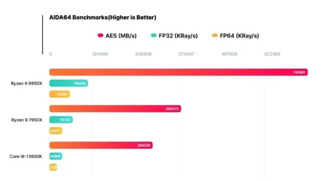 而浮点计算性能就不像AES加密性能那样有点“偏门”了,除普通人不常用到的科学计算外,图形渲染、游戏物理模拟等方面的性能都与浮点计算性能相关,意味着在3D渲染等方面,Ryzen 9 9950X的表现会明显优于英特尔目前的所有酷睿处理器。