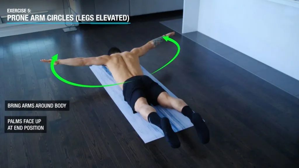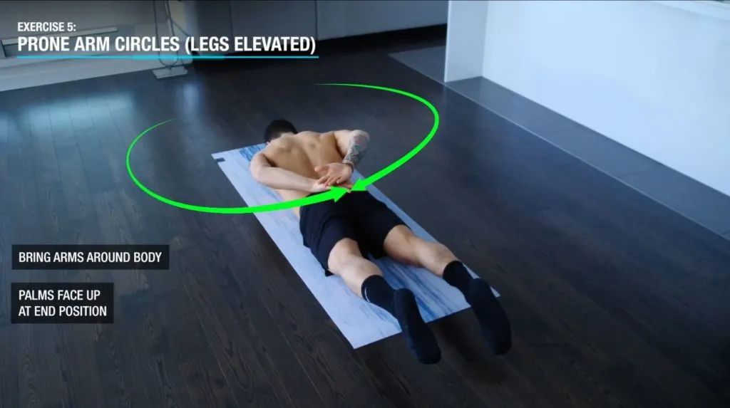 俯卧伸展四肢,手掌朝下,试着让胸部和大腿离开地面,双臂伸展从两侧画圈直至背后。