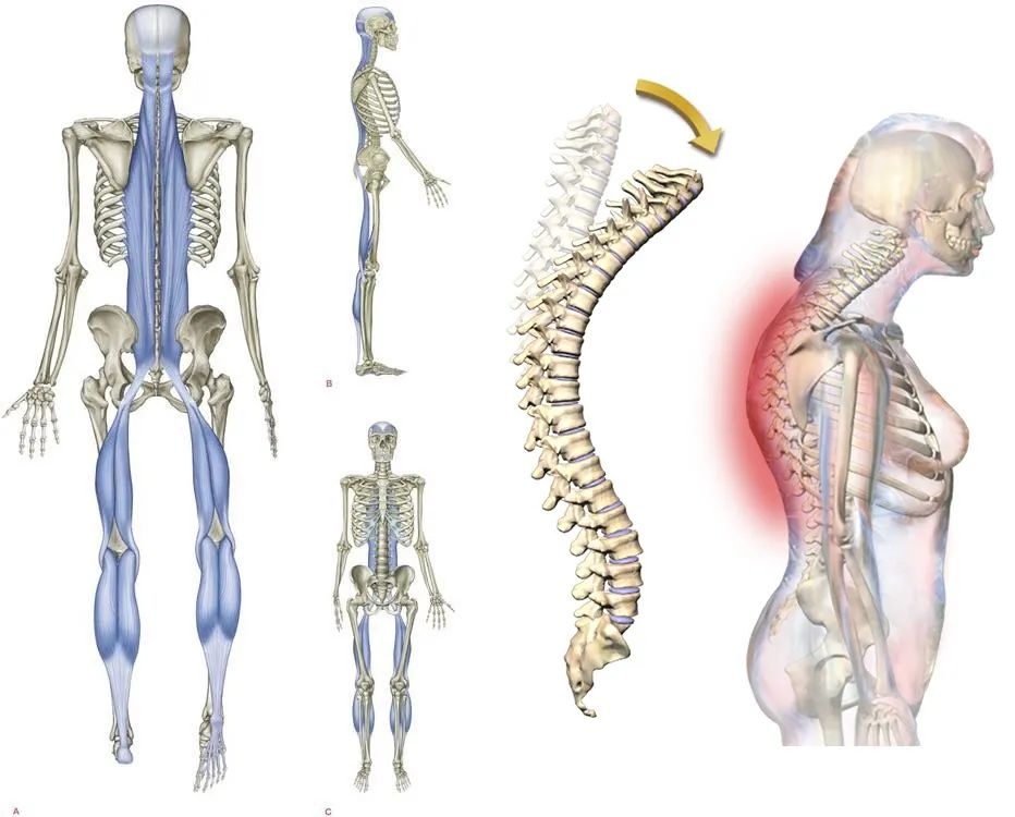 左边为浅背线;右边为圆肩驼背姿态下的脊柱状态