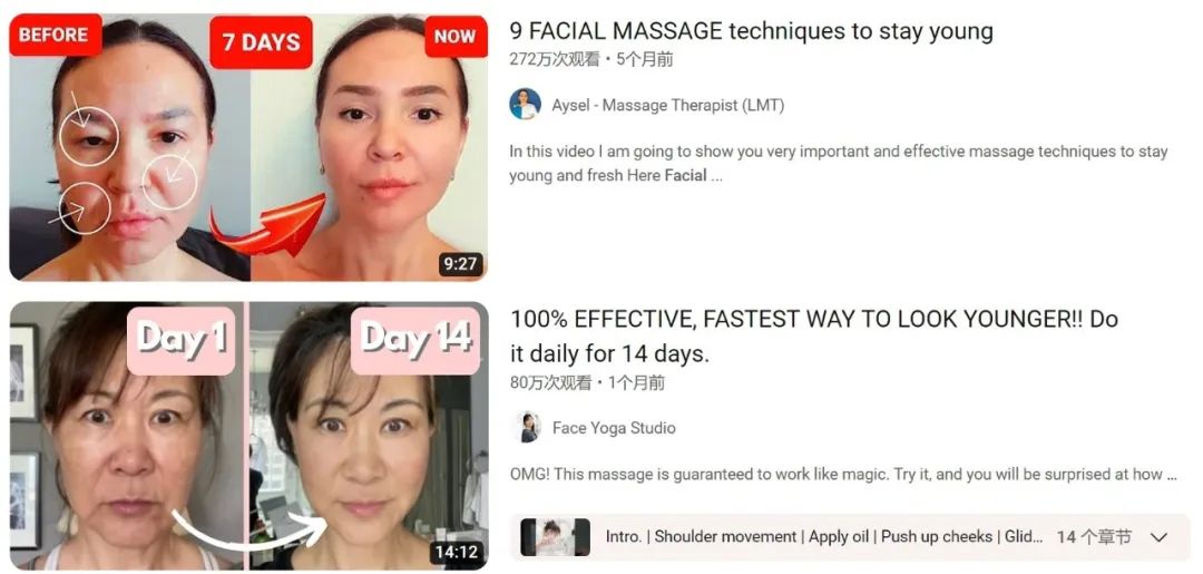 YouTube上近几个月面部瑜伽相关视频超高的观看量,图源:YouTube截屏