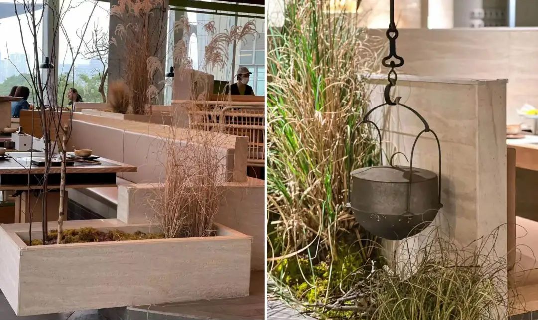 山野火锅店的氛围感从一进店就开始了,这些火锅店以木色、大地色为主,点缀枯树、野草、木柴、绿植、假山,营造出回归山野的氛围感,和之前的破旧风、市井风不同,整体空间更舒展、安静。