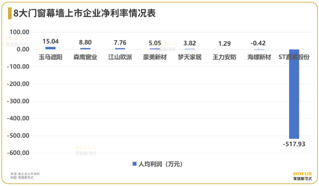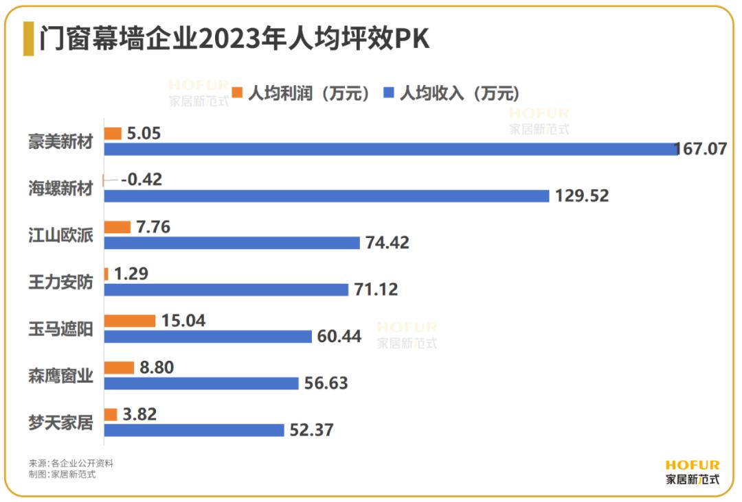 此外,从人均坪效看,家居新范式发现,门窗幕墙上市企业的全员人均销售收入表现虽然不差,在60~80万元/人·年的合格线上下徘徊,但人均利率相比陶瓷卫浴行业普遍在6-8万元/人·年而言,门窗幕墙行业的全员人均利润收入明显起伏较大,显示出行业在人员管理、费用管理、产品附加值等方面的不足。