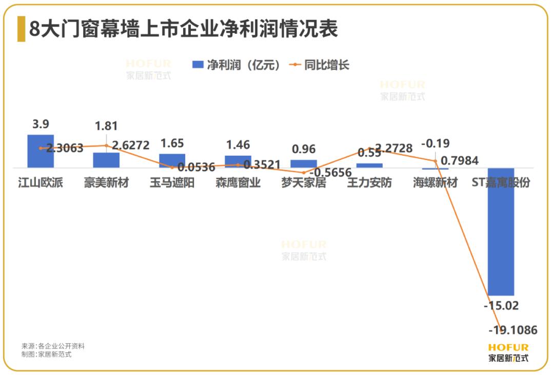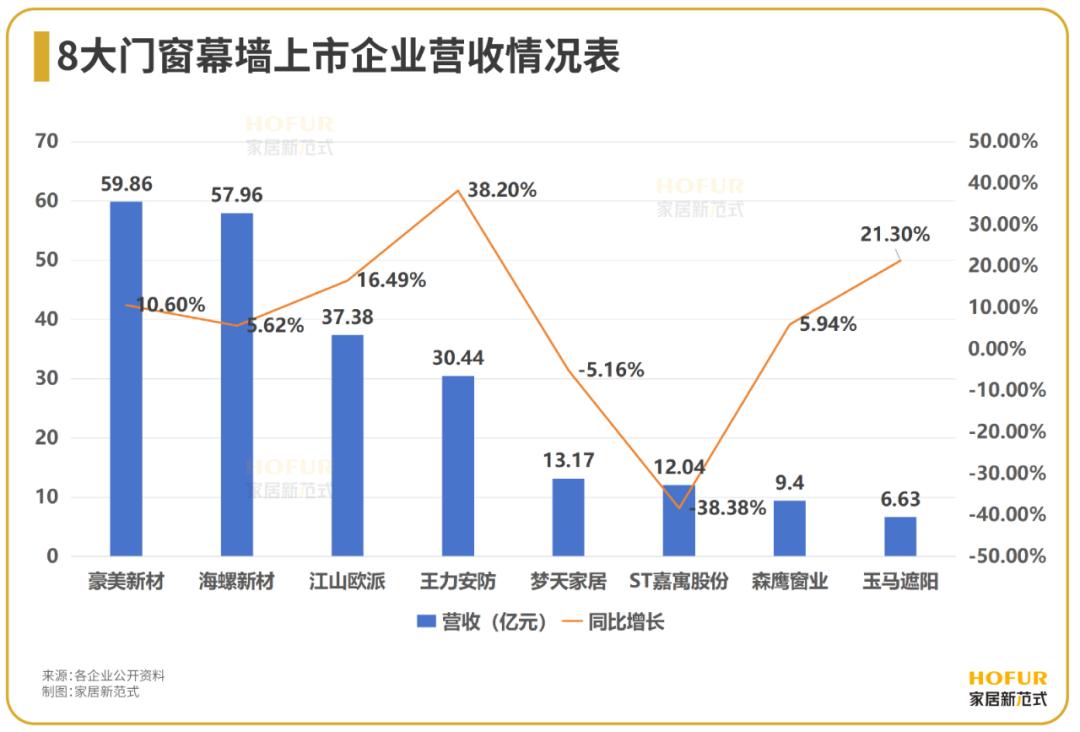 其中王力安防、玉马遮阳、江山欧派营收同比增长分别为38.20%、21.30%、16.49%,位列前三;豪美新材以营收同比增长10.60%至59.86亿元,跻身营收第一。而ST嘉寓股份则以营收同比减少38.38%,排名末位。