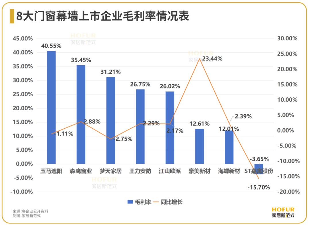 而毛利率基本上能够体现一家公司主营业务的盈利空间和变化趋势。家居新范式统计2023年财报数据发现,8大门窗幕墙上市企业中,5家毛利率超过25%,排名依次是玉马遮阳、森鹰窗业、梦天家居、王力安防、江山欧派,分别为40.55%、35.45%、31.21%、26.75%、26.02%。