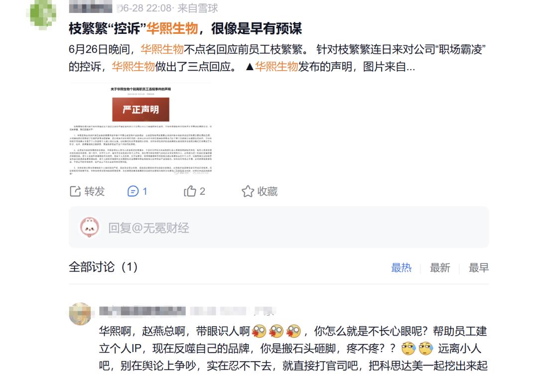 在传统印象中,员工是弱势群体,大公司是“强势方”。而在员工控诉企业的舆论场里,双方身份发生了反转,实际上大公司是比较被动的,华熙生物亦然。而这种情绪一旦在社交媒体大面积爆发,演变成一个社会性事件,公司再有理也会陷入“自证陷阱”,最后疲于应对。所以还有投资者直接调侃华熙生物“没心眼”,支持华熙生物直接诉诸法律: