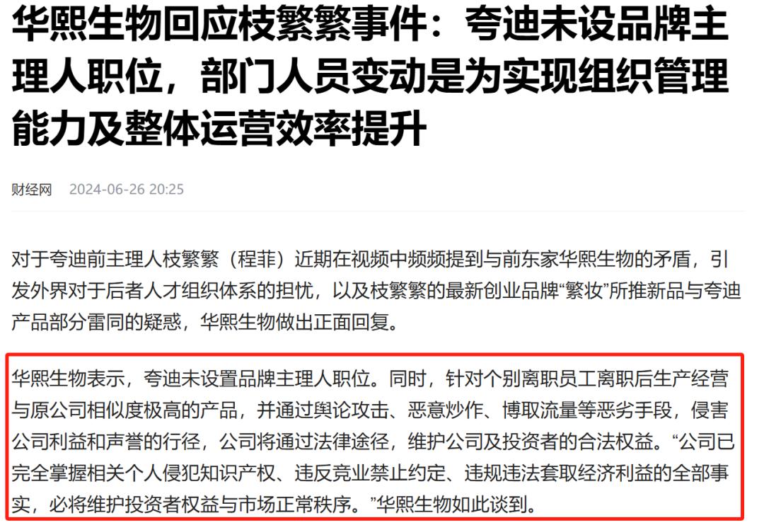 按照枝繁繁的说法,她曾是华熙生物子品牌夸迪的“主理人”。但在财经网等媒体的报道中,华熙生物方表示,夸迪未设置品牌主理人职位,并认为枝繁繁的所作所为违反竞业禁止约定。