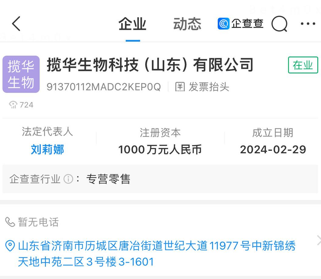企查查显示,繁妆的注册备案人是揽华生物科技(山东)有限公司,该公司于2024年2月29日就已注册,早于枝繁繁离职的2024年3月。枝繁繁离职后,揽华生物又进行了商标注册申请、产品备案,以及产品功效检测。