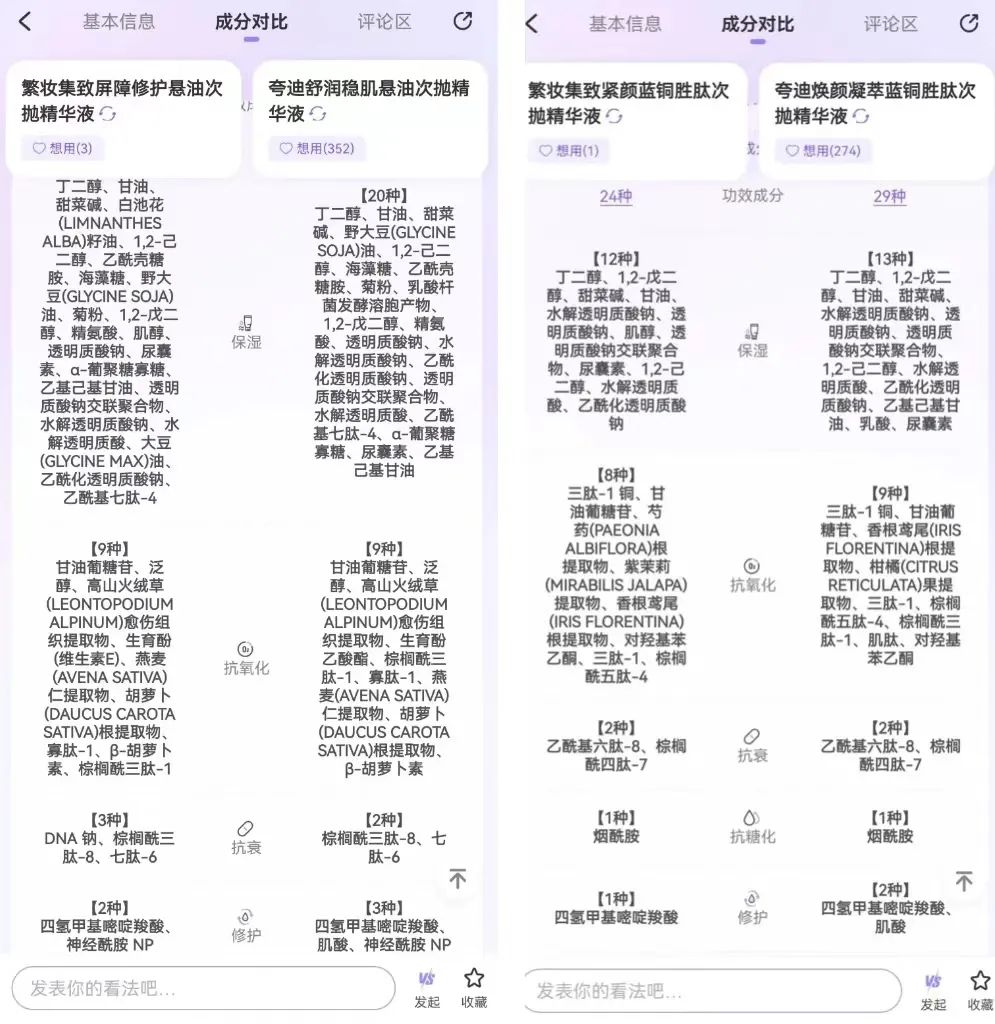 另外,繁妆旗下仅有的两款产品与夸迪的两款明星产品蓝铜胜肽次抛、悬油次抛,从产品名到成分、配方都极为相似。例如繁妆的黄金悬油次抛精华中用到的抗氧化、抗衰和修复成分,跟夸迪的悬油次抛精华所用成分几乎一模一样,仅有个别成分不同,甚至概念也跟夸迪产品高度雷同,都是“以油养肤”。