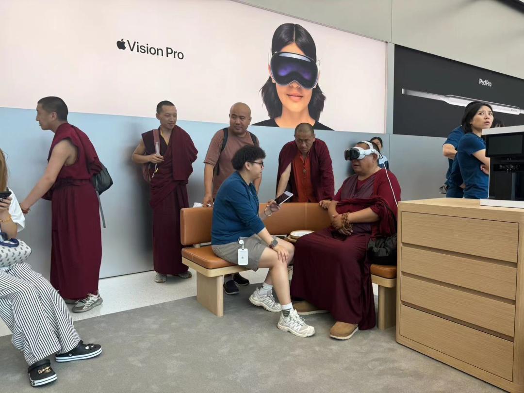 成都太古里 Apple Store,正在店内体验 Vision Pro 的僧人。