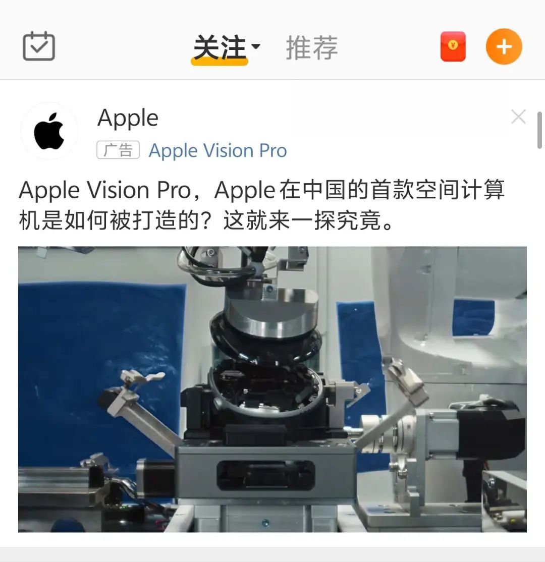 但总体来讲,这些小问题都没有影响到 Vision Pro 首销的整体宣传节奏:苹果使用了超过 iPhone 新品发布的规格来面向中国用户推介这款「划时代新品」:无论是小红书、B 站还是微博,这些主要社交媒体的开屏都能看到与 Vision Pro 相关的广告内容,并且发售首日,苹果还请到了如杜海涛、佘诗曼这样的演艺界明星到场。
