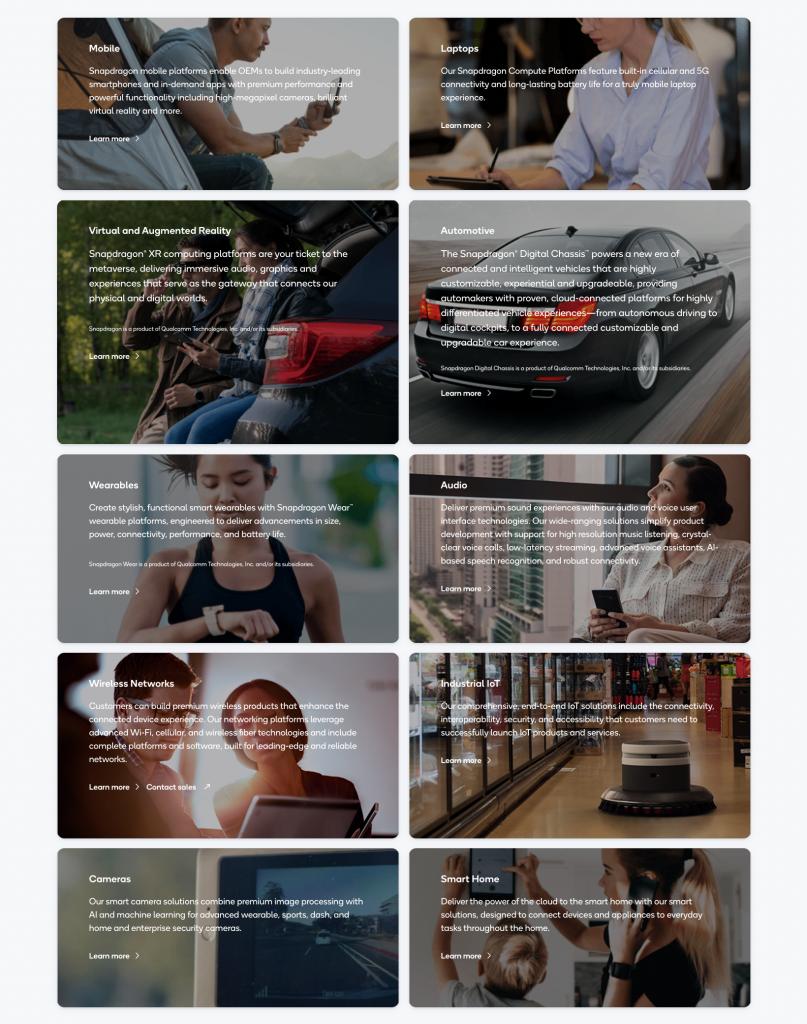如果你点开高通官网,会发现他们已经有了十大平台,除了手机、平板、电脑这种我们熟知的平台外,还有 VR/AR、车机、可穿戴、音频等领域,甚至还有无线网、工业物联网、相机、智能家居这些我们或许不知道高通会涉足的领域。