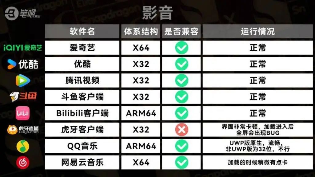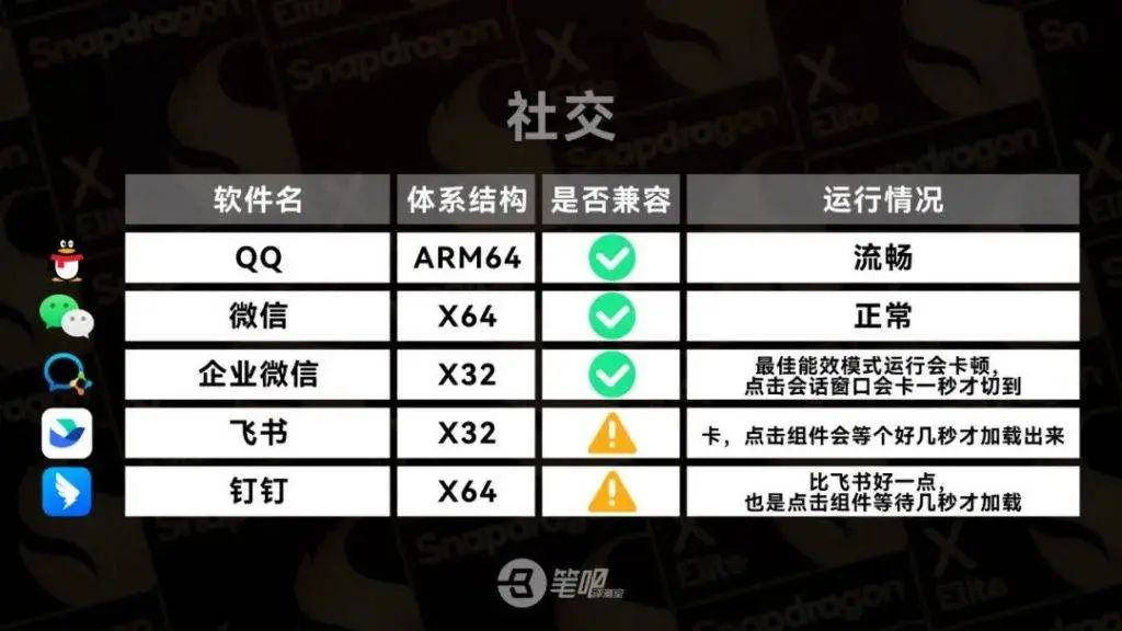 @笔吧评测室 针对国内日常生活和工作使用较多的应用做了个兼容性测试,结果还不错,测试的 21 款应用里,有 2 款无法运行,2 款比较卡顿,具体测试情况如下:
