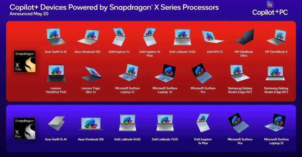 在今年的台北电脑展 ComputeX 上,高通官宣了与微软、三星、宏碁、华硕、惠普、戴尔这六家老牌 PC 厂家的合作,并带来了十余款搭载骁龙 X Plus 和骁龙 X Elite 的新笔记本产品。