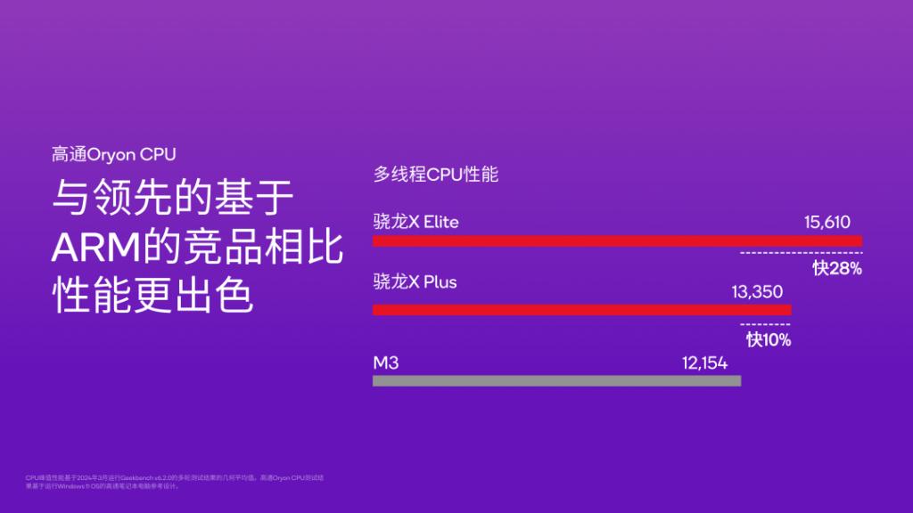 首先,高通骁龙 X 系列芯片终于站了起来,不仅超越了弱小的自己,还有底气和苹果掰手腕,在多核性能上宣称领先了苹果 M3。