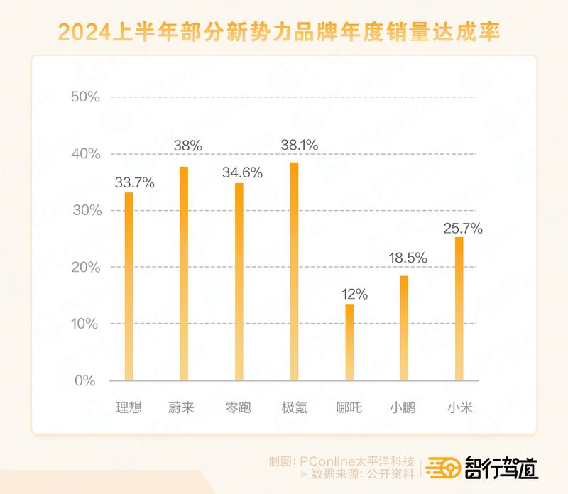 总的来说,新势力们的年度销量目标都不低,但上半年整体完成度都不算高,即便表现最好的极氪和蔚来,销量目标完成率也不超过40%。