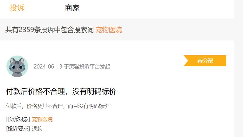 在黑猫投诉平台上,类似这些针对宠物医疗和宠物医院的投诉多达两三千条。