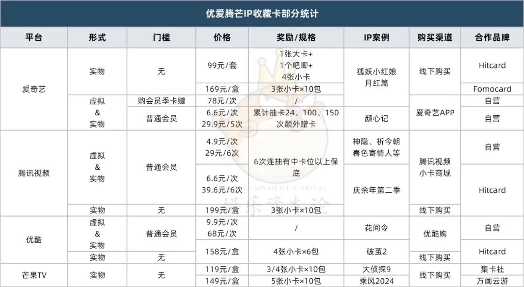 优酷方面,根据优酷数字周边运营负责人介绍,剧集《花间令》鞠婧祎饰演角色典藏卡项目在优酷站内初尝卡牌在线抽卡模式,线上抽取数字卡牌,线下与墨卡文化联动邮寄实体卡牌的虚实结合玩法颇受欢迎,上线后24小时销量达到10万张;“白夜剧场”第3部剧《破茧2》卡牌与Hitcard合作推出实体卡牌。鱿物表示未来会推出更多的剧集卡牌,在优酷及其他外部合作渠道发行。
