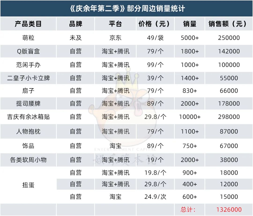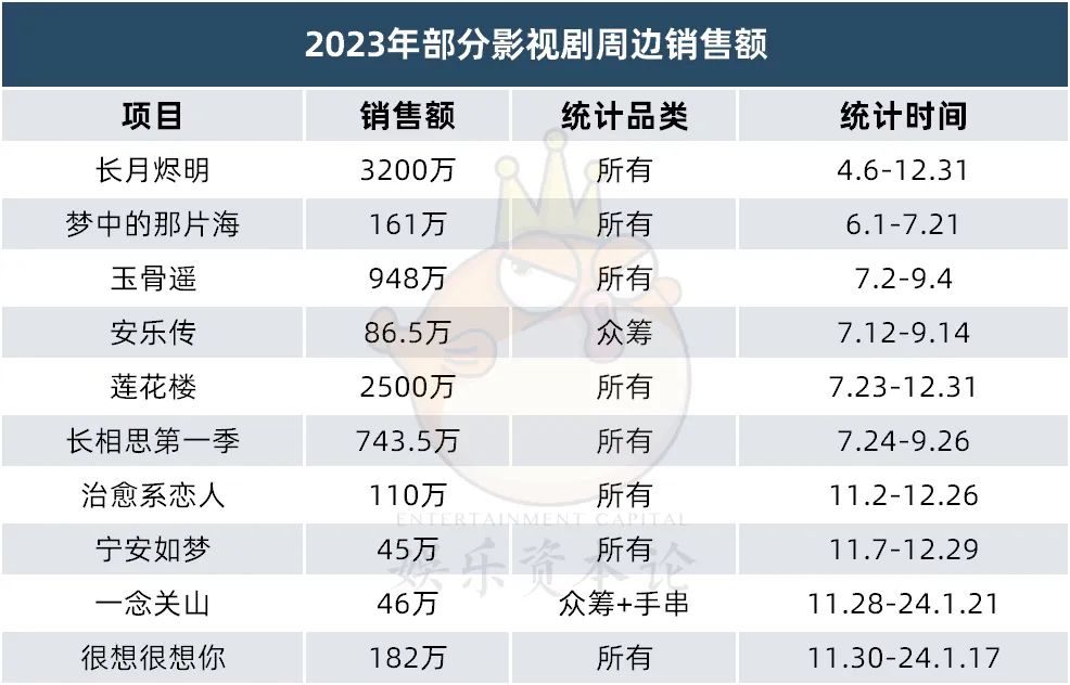 根据娱乐资本论(id:yulezibenlun)统计,去年至今视频平台播出的热剧,谷子类和手串饰品类在周边中占比最多的影视剧,其周边销售额可达到百万量级上下,大件周边众筹成功的爆款剧周边销售额可达千万量级,有一定国民度的爆款剧周边销售额可达三千万量级。