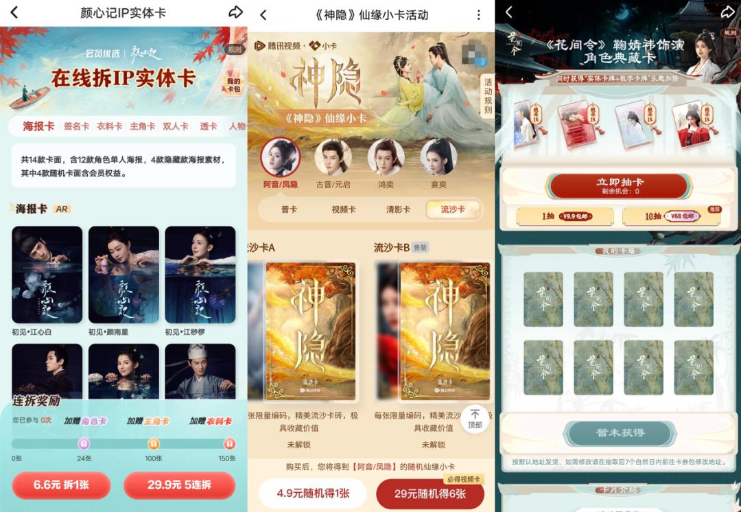 爱奇艺在《莲花楼》时期推出卡牌,正在播出的《颜心计》也同步了线上抽卡,内含“满赠”的福利活动。唯有《狐妖小红娘月红篇》时期,爱奇艺站内推出了“购买会员季卡获取真人剧照卡抽卡机会”的活动,但这一逻辑则与付费线上抽卡、线下拆卡不同,更像是会员卡促销的福利活动。