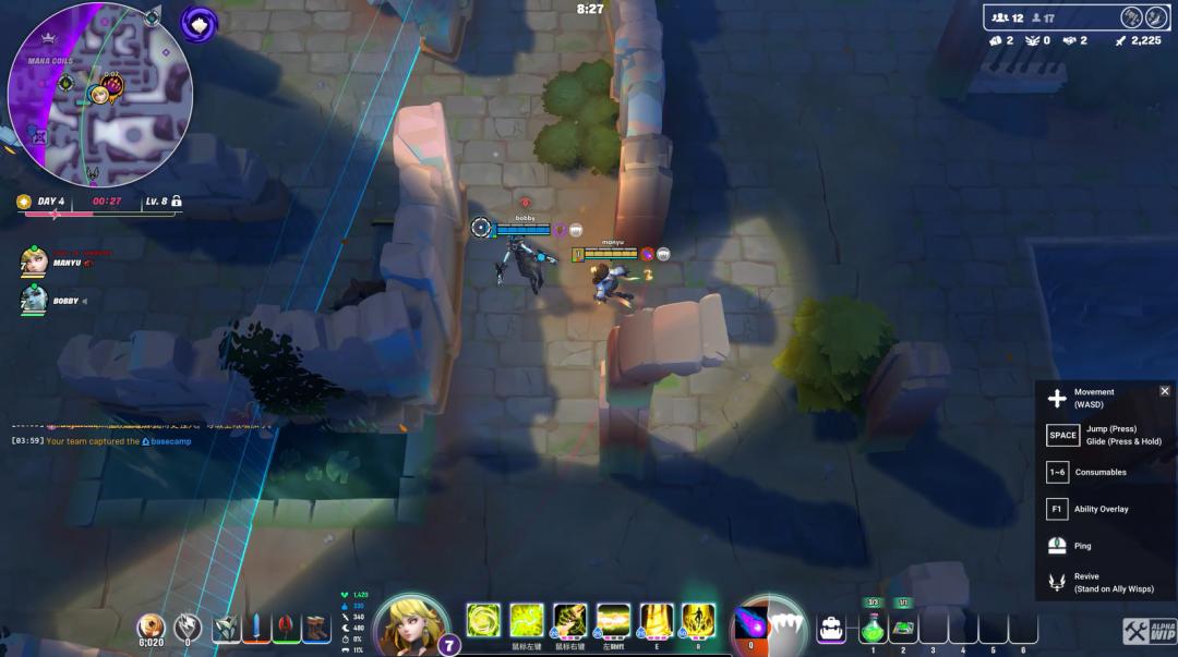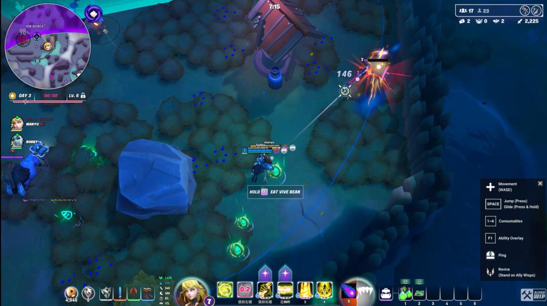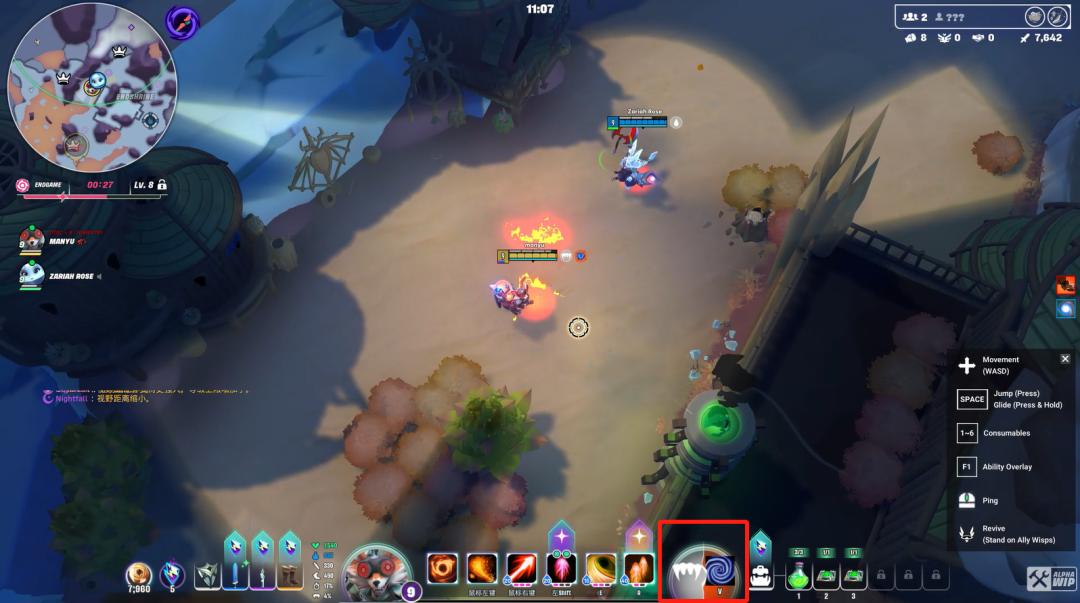 这些技能有的是作为攻击手段,比如发射一枚蓄力的火球;有的作为提高机动性的手段,比如将自己传送到5秒前的位置(像是《英雄联盟》中艾克的终极技能);有的是作为辅佐手段,比如在原地种一片果丛,玩家和队友可以采摘食用并恢复生命……