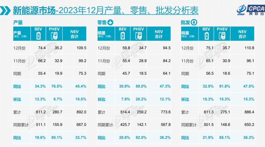 纵观全年终端成绩单,886.4万辆的新能源乘用车批发销量中,纯电达到611.3万辆,同比增长32.9%;插混与增程达到275.1万辆,同比增长91.8%。
