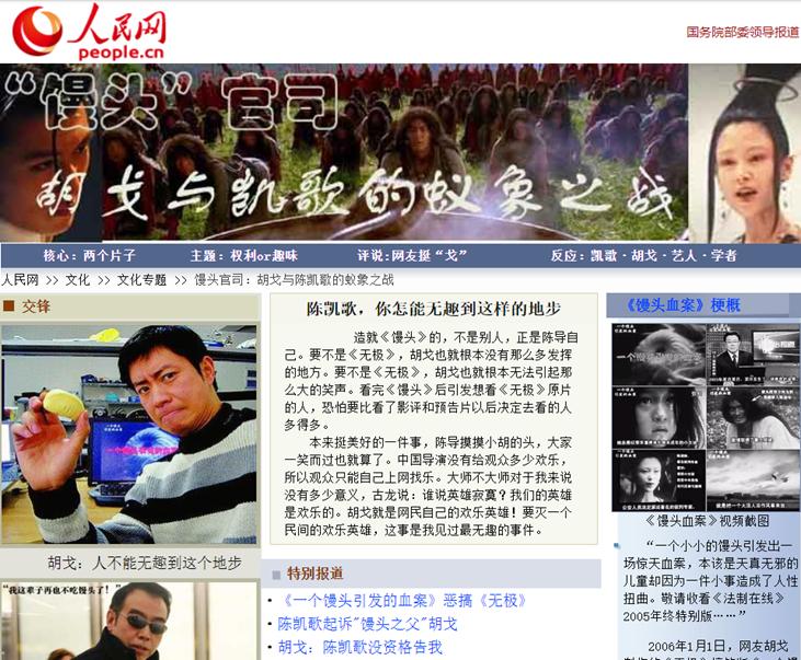 人民网2006年2月制作的《“馒头”官司:胡戈与凯歌的蚁象之战》专题截屏。(图/人民网)