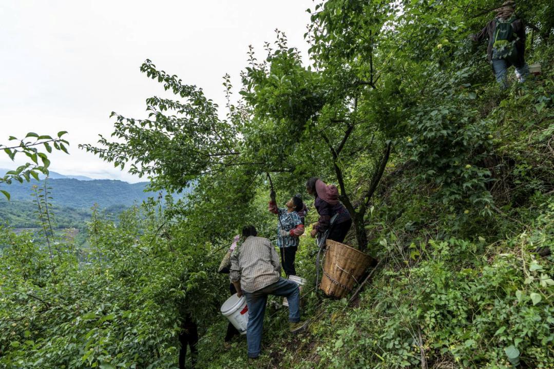 他们站在几乎垂直于地面的陡坡上,一边提防着自己别掉下去,一边还要打望头顶别有石头掉下来。这些梅子最先要村民用竹筐一趟趟背到山里的大路上,再由骡子转运到乡村公路。