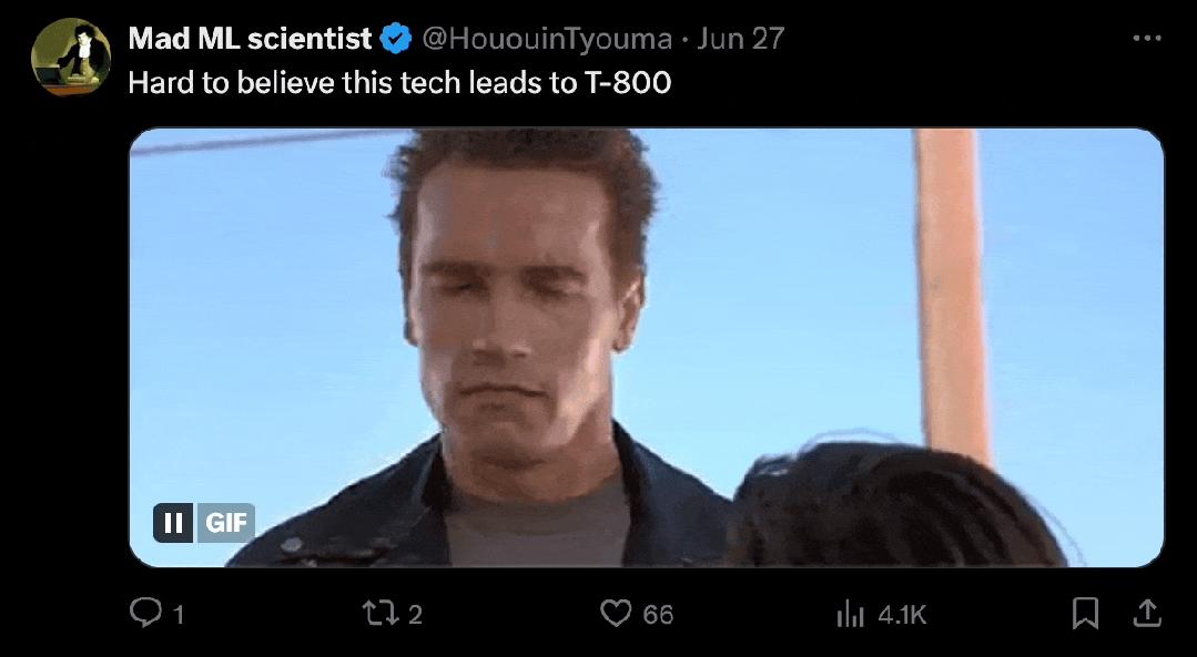 不少网友看到后联想到了「终结者」,毕竟图中的微笑确实很像施瓦辛格在《终结者》中的表演。
