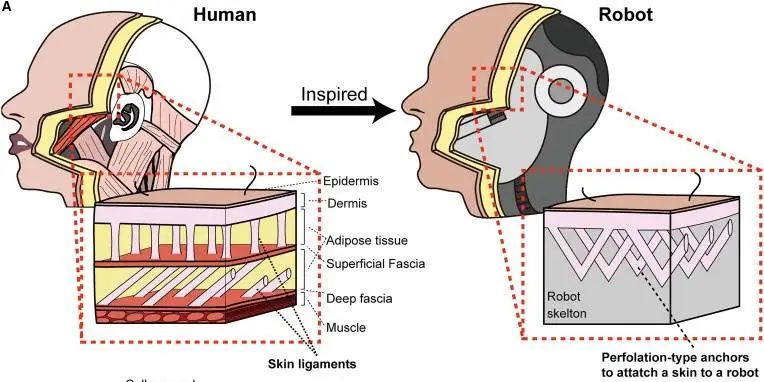 而日本科学家竹内昌治在其论文《穿孔型锚,灵感来自皮肤韧带,用于覆盖活体皮肤的机器人面部(Perforation-type anchors inspired by skin ligament for robotic face covered with living skin)》中描述的这个方法,由于其生成的皮肤是由人类皮肤细胞培养而成的混合物,所以在视觉触感上与人类皮肤很像,而且在很大程度上解决了机器人皮肤固定的问题。
