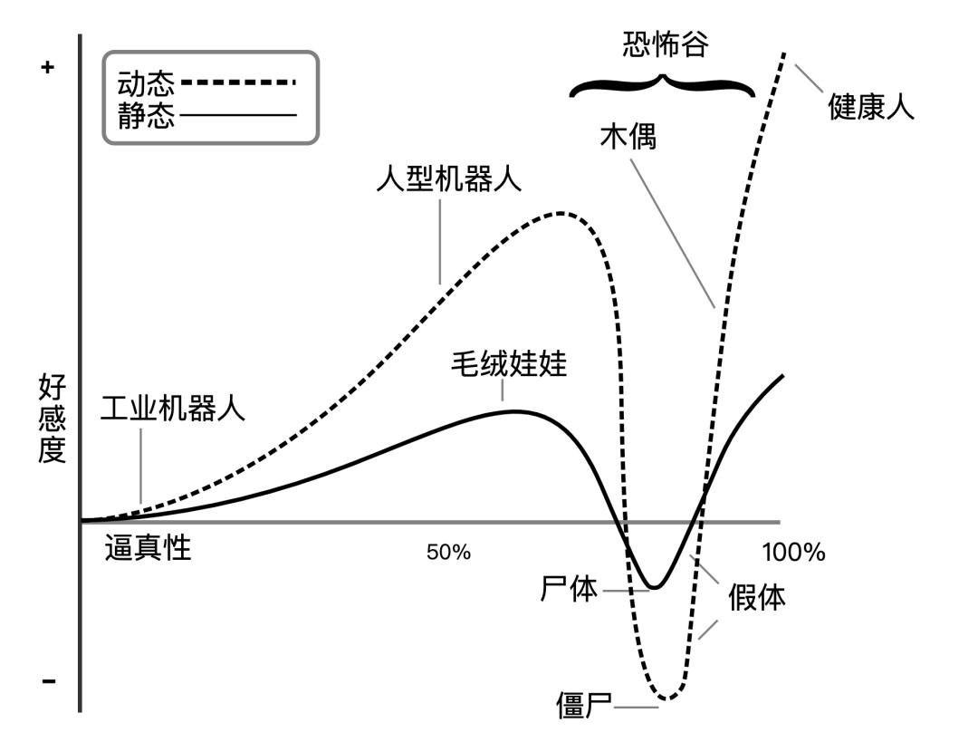恐怖谷效应——当人形机器人或仿真图像变得非常逼真但又不完全时,人们会感到强烈的不安和反感