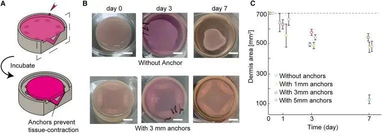 实验还显示,使用穿孔型锚点对于固定皮肤等效物至关重要,否则组织会因收缩力分离。