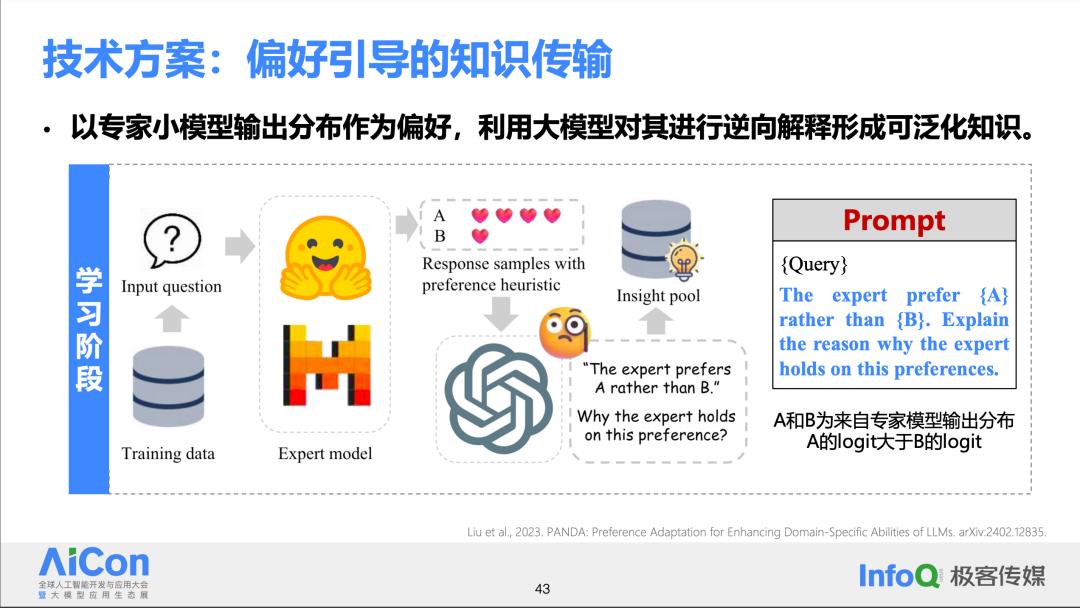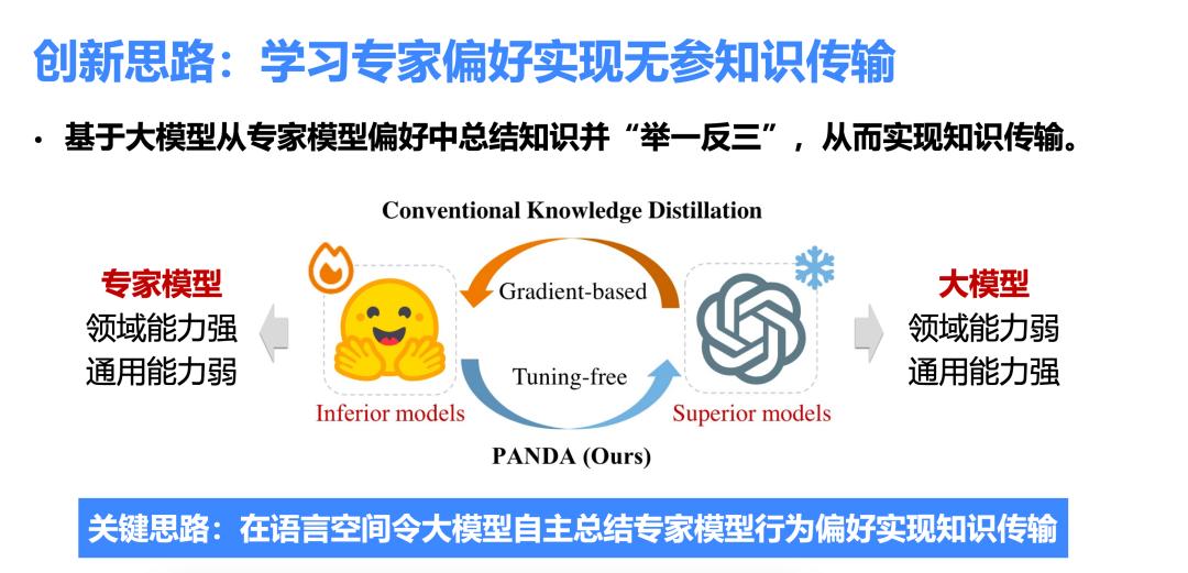 鉴于目前的情况,清华提出了一种新的方法,称为基于专家偏好的无参数知识传输。这种方法的核心思想是利用大模型从专家模型的偏好中提取和总结知识,并能够由此及彼,实现知识的迁移和应用。如图所示,利用大模型在语言空间中总结专家模型的行为偏好并用文字形式表达出来。通过这种方式,将总结出来的偏好转化为知识,并将这些知识固定下来,以便在未来的工作中提供指导。